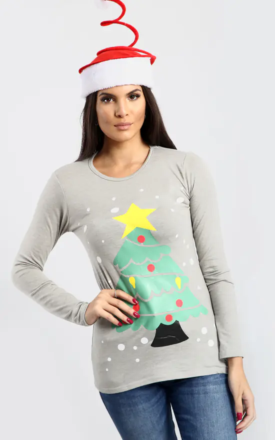 Enjoy and glam this X-Mas Season in our Elsie Christmas Reindeer & Santa Print Long Sleeve T-Shirt In Grey, featuring graphic print of Reindeer & Santa on a Soft and Comfortable Material.