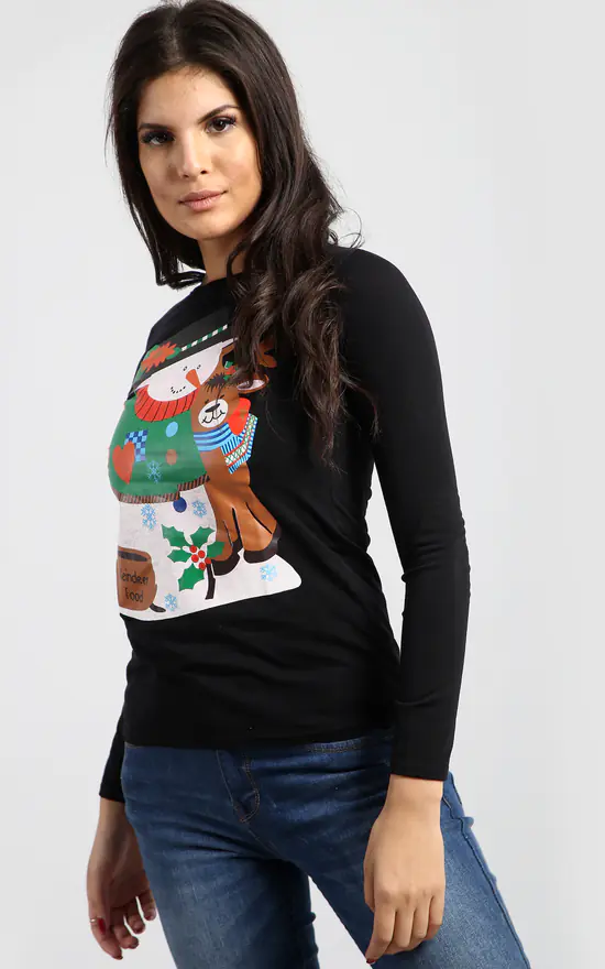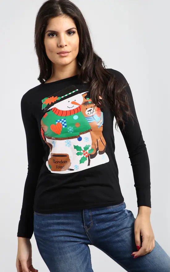 Jessica Christmas Long Sleeve Tshirt In Black! Slay the ho-ho-holidays this season in our Christmas T Shirt Dress featuring Snowman And Reindeer print and long sleeves