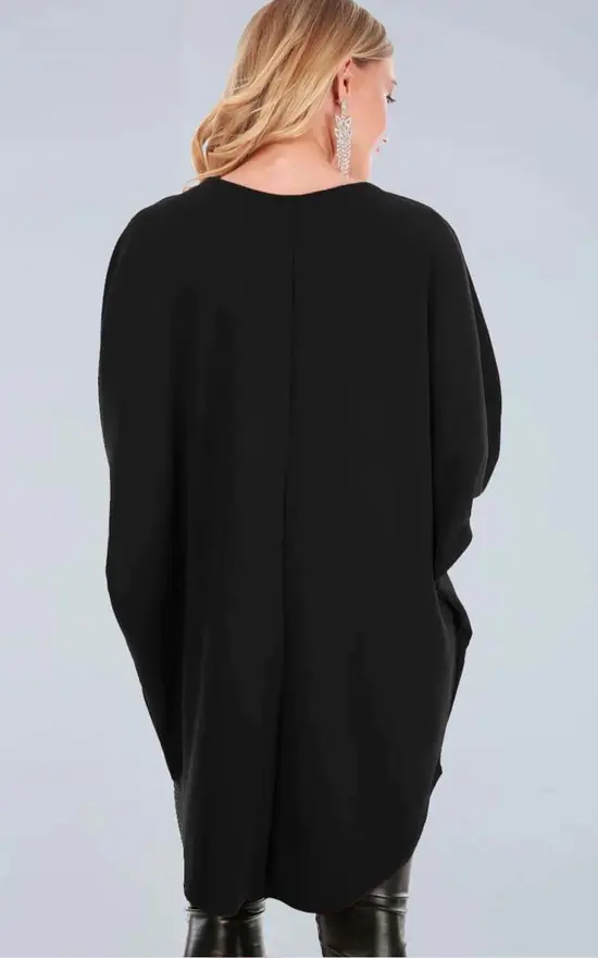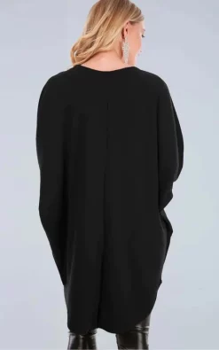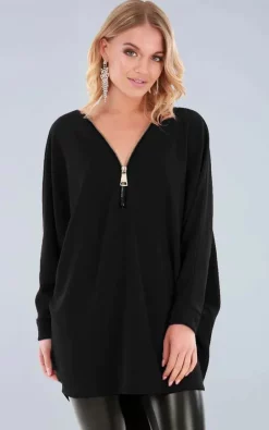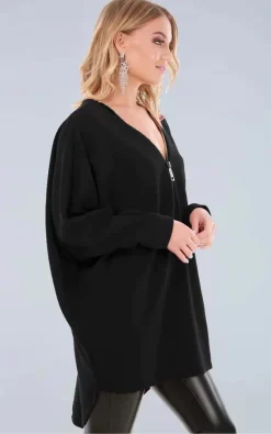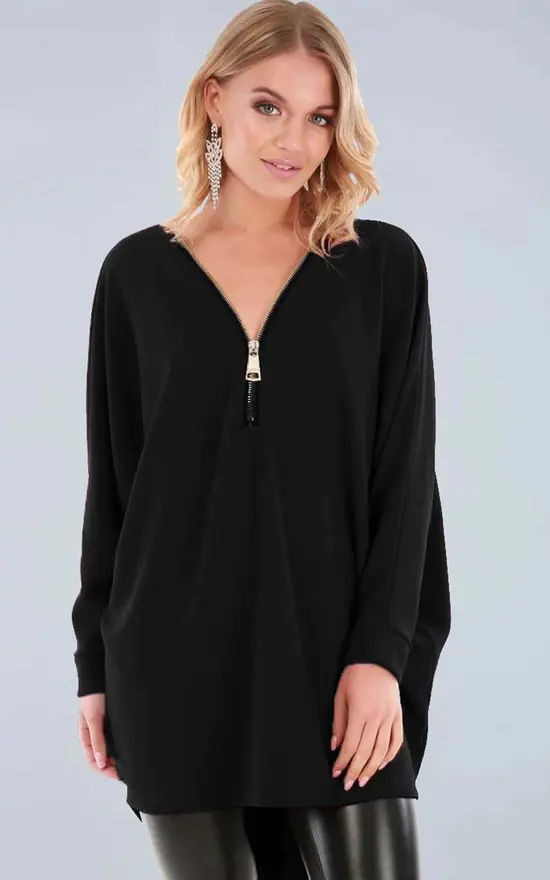 Look effortless in this oversized dip hem top, featuring a chunky zip front team this wardrobe staple with faux pu trousers and barley theres for a night out with the girls