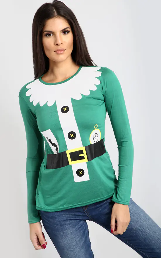 Get ready for X-mas and slay the ho-ho-holidays this season in our Mia Christmas Belted Santa Costume Long Sleeve T Shirt In Green, featuring a soft jersey material.