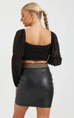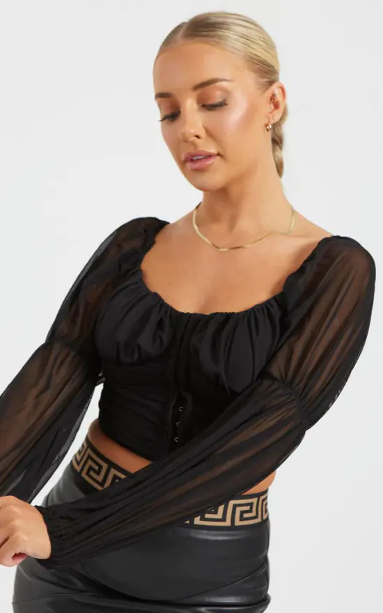 Our Black Mesh Pleated Crop Top is part of our latest Crop Top collection. Featuring an a long sleeve mesh crop top with padded breasts, corset style hooks on the front of the top and pleats. Pair with a pair of high waisted jeans for the perfect outfit.