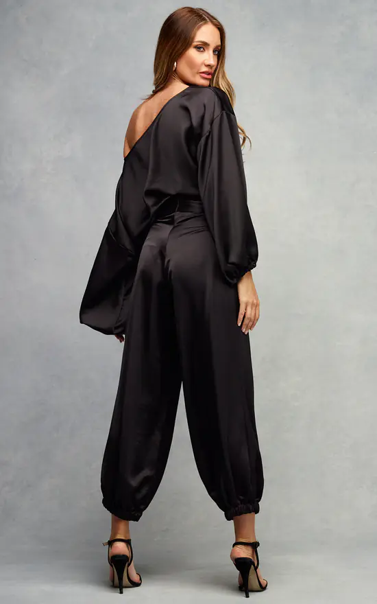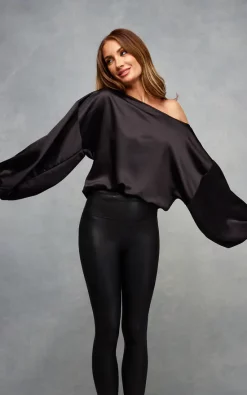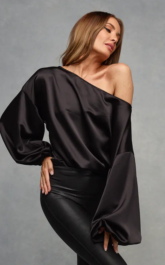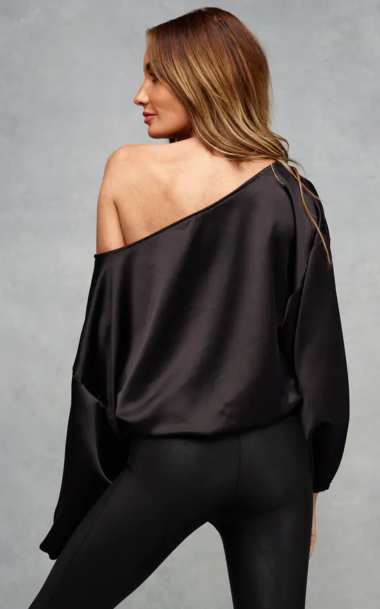 Heidi Oversized Top Midnight Black Satin. A gorgeous oversized satin off the shoulder top with elasticated sleeve and hemline. The perfect party top for that nice top and jeans look.