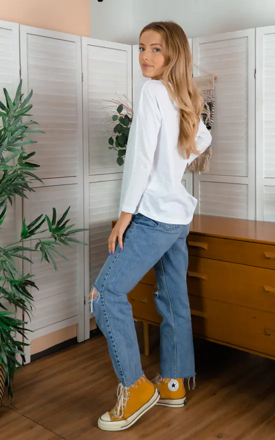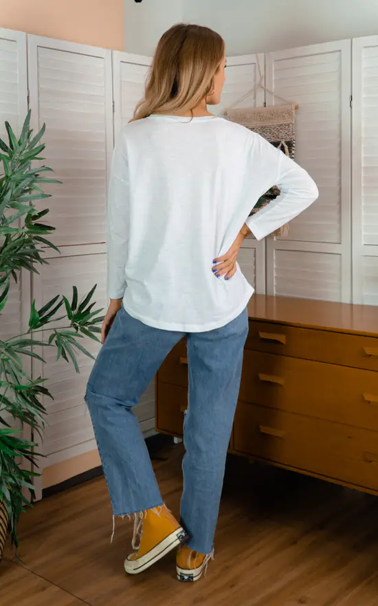 This organic T-shirt is a great basic for any style! This top has a dropped shoulder, 3/4 length sleeves and a slightly curved bottom hem to give your relaxed style that extra bit of detail.