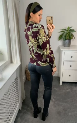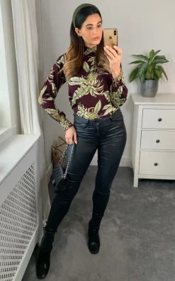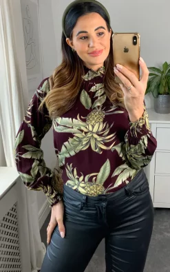 Great baroque pineapple print high neck top in claret red with shirring detail on neck and sleeves . Raglan sleeves and a straight hem make a neat fit to wear with jeans, slacks and skirts , great for layering and for day to night wear .