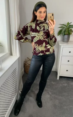 Great baroque pineapple print high neck top in claret red with shirring detail on neck and sleeves . Raglan sleeves and a straight hem make a neat fit to wear with jeans, slacks and skirts , great for layering and for day to night wear .
