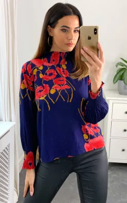 Pretty Poppy print high neck top in navy and red with shirring detail on neck and sleeves . Raglan sleeves and a straight hem make a neat fit to wear with jeans, slacks and skirts , great for layering and for day to night wear .