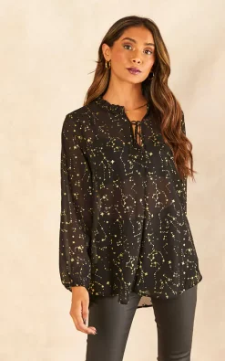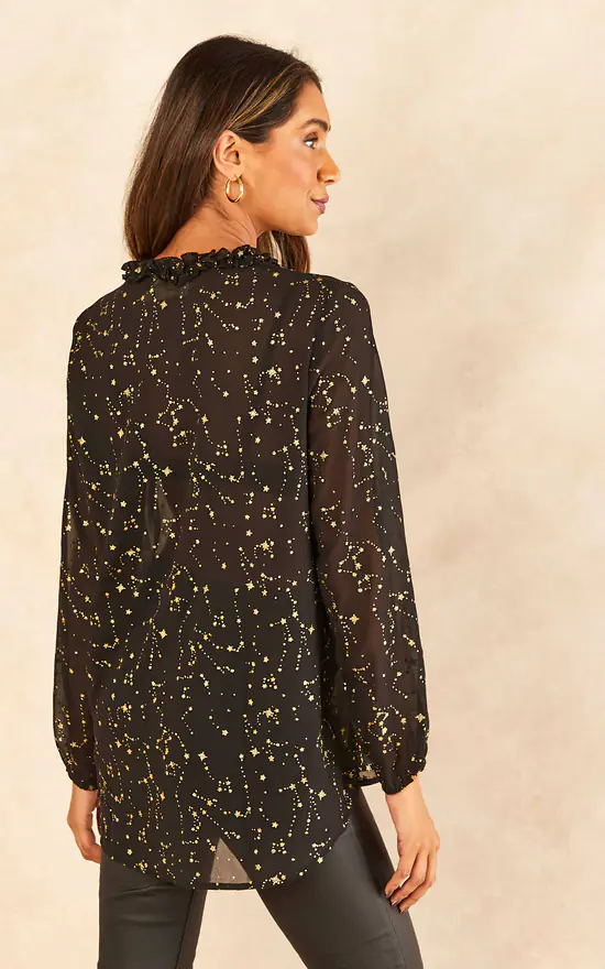 Look fabulous this party season with this stunning constellation print blouse. With long sleeves and a Grandad Collar, this elegant top will dress up any outfit. Wear with a skirt, skinny jeans, leggings or trousers. Ideal for a night out, Christmas parties or as a fun and flirty addition to your winter wardrobe.