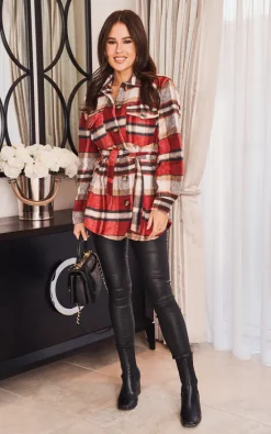 Meet Lenis in a new colourway- we are loving the on-trend red check print! Our new belted shacket (when a shirt meets a jacket) is one for your baskets. This cosy addition to your wardrobe is a must, made from a a warm handle knitted check fabric, we’re thinking its ticking all the boxes. Style open with a body and jeans or button up and belt completely and wear with leather look trousers, the choice is yours!
