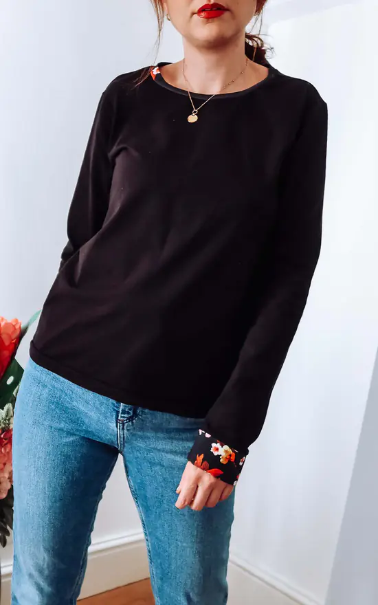 A wardrobe staple for work to weekend the black long sleeve top is cut from a super soft cotton jersey. Featuring bespoke floral print tailored cuffs and neck trim. A slim fit. Red, orange, and yellow hues and a pop of colour in the digital floral print. Each garment is unique with various floral print placements. Add an SCD twist to a timeless everyday essential