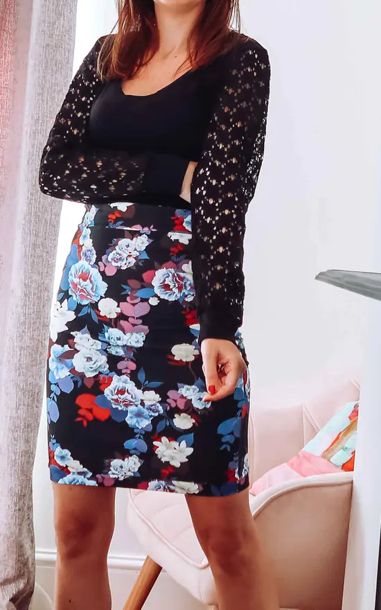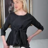 Silky soft black jersey top cut from a Tencel cotton blend. Floral lace long sleeves with a tailored cuff. Flattering v-neckline with a fitted body contouring silhouette. An all year round essential dress up or dress down.