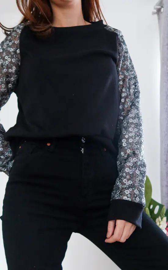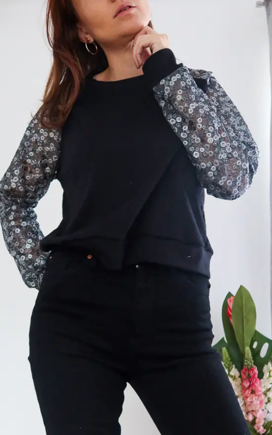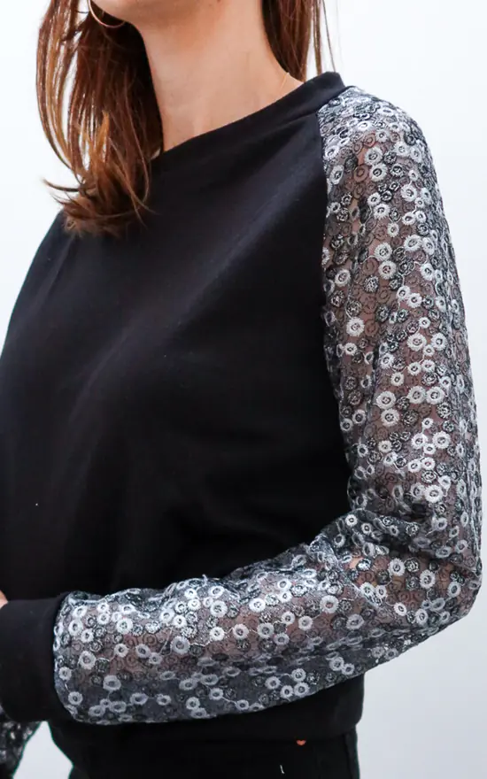 Add a touch of sparkle to your wardrobe with this beautiful black cotton jumper top with a raglan sleeve. Mid-weight super soft light black cotton jersey paired with embroidered clear sequin sleeves means this timeless style will sure to be one your favourites.