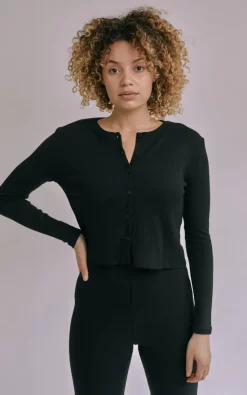 Long sleeve jersey ribbed cardigan with centre front button up detail.