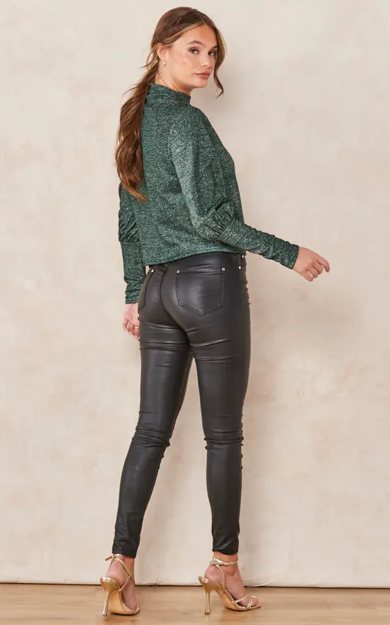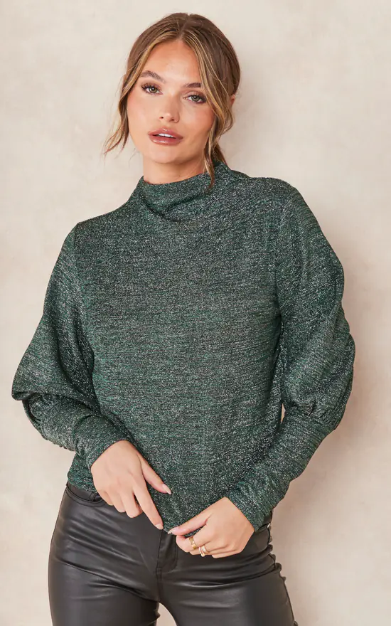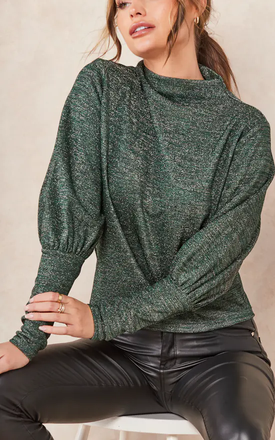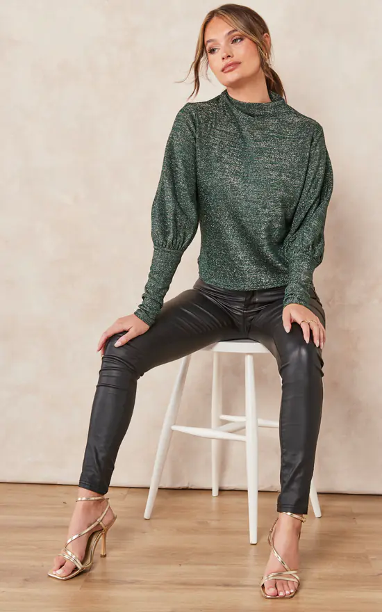 An add bit of glimmer glamour for those long winter months in our Sharp Objects Funnel Top. A loose-fitting top with lantern sleeves, fitted cuffs and mock turtle collar. 80% polyester, 15% metallic and 5% elastane. Machine wash 30c.