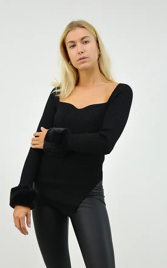 Add a little sass to your look with this ribbed top featuring faux fur cuffs and a sweetheart neckline.
