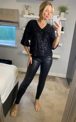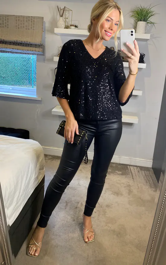 Perfect matched with skinny leather trousers, this all-over sequin detail black top comes in a relaxed, flattering fit, with statement fluted sleeves and a peep hole back fastening.