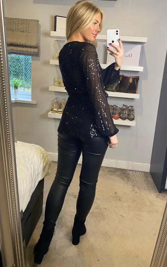 Hit the town in style in this stunning all over sequin, black wrap around top. Features balloon sleeves, a wrap around shape to flatter your curves, and a statement velvet tie. Match with black skinny jeans or leather trousers and strappy heels or boots.